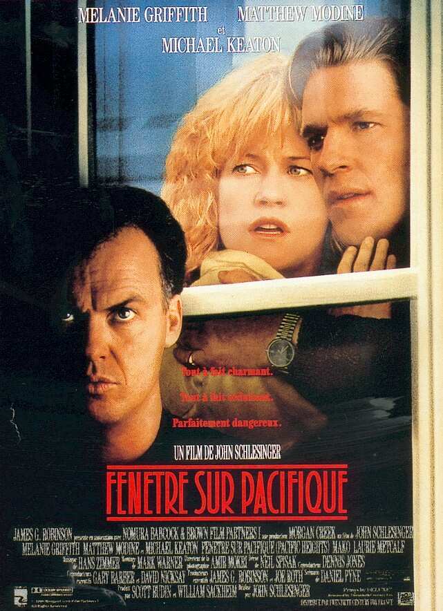 Un bon thriller basé sur des faits réels interprété sans faille par Michael Keaton. Très bon film à suspens. Film stressant du debut à la fin. Un excellent thriller. Matthew Modine et Mélanie Griffith incarnent un couple. Micheal Keaton interprète un locataire psychopathe qui veut garder la maison pour lui tout seul. Inspiré de faits réels, cette histoire fait froid dans le dos. S'inspirant d'un fait divers réel, Fenêtre sur Pacifique raconte comment un couple va voir sa vie bouleversée par leur locataire... La réalisation de John Schlesinger est excellente, bien que l'on aurait souhaité plus de plans fixes, mais les superbes prises de vue compensent ce petit défaut. Le scénario est génial, très stressant et on ne s'ennuie pas une seconde. Le film est très bien monté, les décors ne sont pas nombreux mais sont très beaux, une musique un peu absente mais très oppressante. Un terrible thriller comme on les aime. Un film saisissant. On ressent bien l'injustice dont est victime le couple. Michael Keaton est remarquable dans ce rôle d'escroc. Ce Thriller mériterait d'être plus connu, car il est vraiment excellent. Une bonne mise en scène, et un scénario que j'ai trouvé plutôt original. Quand aux acteurs leurs rôles respectifs leurs vont comme un gant. Le couple "Melanie Griffith-Matthew Modine" est vraiment très convaincant. Michael Keaton, lui interprète très bien son rôle de psychopathe vraiment très troublant et bizarre. Je vous conseille vivement ce film qui mérite d'être vu!