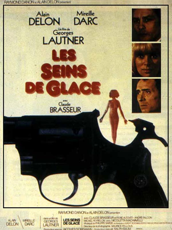 Le film de Georges Lautner a été descendu par les critiques de l'époque, qui reprochaient au réalisateur d'avoir trahi le roman d'origine. Personnellement, j'ai trouvé le film assez plaisant, bien que le montage ne soit pas très équilibré, n'arrivant pas à trouver la bonne alchimie entre les moments de suspense et les moments plus légers. Les moments de suspense sont plutôt réussis d'ailleurs, notamment une scène assez stressante dans un parking. On sent bien l'influence d'Hitchcock. Mais pas mal de scènes alourdissent un peu l'ensemble, en particulier celles entre Claude Brasseur et Mireille Darc. .Bref, "Les Seins de Glace" ne fait pas parti des meilleurs films de Lautner, mais il se laisse regarder. Sorti en aout 1974, ce film de Lautner est aujourd'hui tombé aux oubliettes et c'est regrettable. Car même si ce film n'atteint pas des sommets il a le mérite d'être efficace. D'un point de vue personnel je pense qu'une nouvelle exploitation de ce film au cinéma serait la bienvenue, cela permettrait au public de le redécouvrir et de lui faire comprendre que ce film malgré son côté sobre et un peu lent n'est absolument pas dépourvu d'intérêt comme en témoigne son succès auprès du public (presque 1,5 millions d'entrées) lors de la sortie en 1974. La grande force du film c'est sans doute son casting, on y découvre un Alain Delon superbe campant un personnage riche et profondément déroutant, envouté par l'imprévisible Mireille Darc affublée de l'étiquette de femme fatale. Quant à Claude Brasseur il bouge beaucoup et cabotine mais reste toujours très sympathique, d'autres gueules d'habitués font belle figure autour du trio phare comme Michel Peyrelon. Ces seins de glace font l'effet d'un divertissement agréable, toutefois l'histoire manque singulièrement de souffle. Un polar un peu décevant , très lent et plombé par une histoire qui n'est pas clair mais heureusement que le casting rattrape un peu les choses . Une sombre affaire d'amour et de folie , un scénario plutôt original dans un sens mais peu développé , même si on a droit a quelques moments de suspense et de fausses pistes qui tente de redonner du tonus a un film qui en manque beaucoup . Comme héros un peu la par hasard , Claude Brasseur est vraiment bon et arrive a faire rire avec son style un peu déconneur et souvent loin des problèmes , face a Mireille Darc un peu statique mais intrigante et un Alain Delon séducteur mais pas au top de sa forme . Parfois inquiétant mais jamais angoissant, Les Seins de glace est un thriller qui bénéficie d'une bonne histoire, les acteurs sont bons mais la réalisation ne parvient pas à nous faire capter par l'intrigue ; on met du temps avant de réellement entrer dans le vif du sujet, le film n'est jamais vraiment prenant. A signaler une fin qui toutefois n'est pas mal du tout.