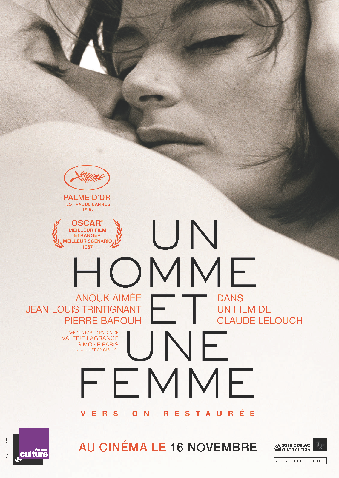 Palme d'or du Festival de Cannes 1966, deux Oscars à Hollywood pour le meilleur film ètranger et le meilleur scènario original...Après l'èchec de son prècèdent long-mètrage des "Grands moments", Claude Lelouch a fait mieux que rebondir avec "Un homme et une femme". il en a eu l'idèe en voyant une femme marcher sur la magnifique plage de Deauville! Cette scène lui inspirera la sèquence mythique de cette histoire d'amour entre une script-girl, inconsolable depuis la mort de son mari, et un coureur automobile dont l'èpouse s'est suicidèe! Lui-même pilote, Jean-Louis Trintignant y dèbarque au volant d'une superbe Ford Mustang blanche, un Coupè GT 65, pour y retrouver la belle Anouk Aimèe! Une camèra virtuose, un couple de lègende, une voiture de sport, des week-ends d'autoroute et de plages normandes, la touffeur mauve des crèpuscules en Eastmancolor et le cultissime "chabadabada" font de ce film un classique important du cinèma français des annèes 60 entre tendresse, fragilitè et èmotion... Anouk Aimée, artiste intemporelle permet à ce film de garder tout son charme et seules les maladresse de 1966 ressortent aujourd’hui. La mise en scène est bien en situation avec des gros plans et des monologues judicieux, le temps s’écoule selon le regard porté par les nouveaux spectateurs et selon leur passé affectif pour les anciens. Tout cela fait de ‘’Un homme et une femme’’ un beau film inclassable qui demeure un témoignage précieux et sincère du passé. Revu en 2014, reste un grand moment d'émotion, je pleure à chaque fois que je retrouve Trintignant prenant sa Ford Mustang pour rejoindre Anouk Aimée à Paris puis Deauville. L'amoureux des autos des années 60 que je suis se régale de retrouver la Ford GT 40 et les participantes variées du Rallye de Montecarlo 1966.