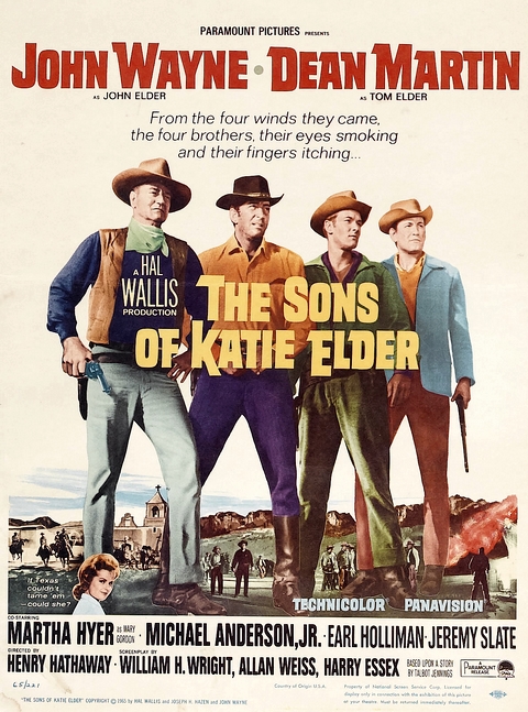 Un Western plutôt mineur malgré une affiche intéressante et une intrigue assez bien trouvée. Les 4 cherchent la vérité au sujet de leurs parents et découvrent sur leur chemin méfiance et animosité. Leur quête de la vérité va s'avérer alors plus intense. Il y a quelques scènes d'action mais il faut attendre la dernière demi-heure pour voir se développer tout une pléiade de suspense et de règlements de compte. Pas mal quand même. Quand Katie Elder (qu'on ne voit jamais en fait) meurt dans la misère, ses fils (et quels fils!) découvrent que le ranch familial a été perdu au jeu lors d'une partie truquée par leur père, juste avant que ce dernier soit assassiné! En plein déclin du western (nous sommes en 1965), le cinéaste Henry Hathaway signe un western de bonne facture et plutôt bien ficelé, réunissant une belle pléiade d'acteurs! On retrouve pour notre plus grand plaisir John Wayne et Dean Martin, le duo mythique de "Rio Bravo". L'efficacité des scènes d'action va de pair avec une véritable réflexion sur l'honneur et l'amitié! Un western de facture très classique mais très agréable à regarder... Les 4 fils de Katie Elder est un western agréable de la part de Henry Hathaway, même si je m'attendais à un peu mieux de la part d'un tel réalisateur. La mise en scène ne manque pas d'intêret sur cetaines séquences et le casting est plutôt bon dans l'ensemble, avec une mention spécial pour John Wayne et Dean Martin à la hauteur dans les rôles de deux des fils de Katie Elder. Dans ce western, nous retrouvons également le toujours très bon Paul Fix ( le Dr Miller dans El Dorado ) qui joue le rôle du shérif Wilson et Dennis Hooper dans un second rôle étonnant. Autres éléments positif du film, il s'agit d'une part de la partition musicale du génial Elmer Bernstein ( Les sept mercenaires, Comancheros ) qui donne pas mal de punch à l'oeuvre et qui prouve qu'une musique peut être un élement très important dans un western, et d'autre part de la belle photographie en Technicolor de Lucien Ballard ( Coups de Feu dans la Sierra ) qui donne du charme à l'ensemble du film. L'histoire est par contre sans surprise et manque singulièrement d'originalité, ce qui fait que ce western des années 60 ne rentrera pas dans les annales en ce qui me concerne. On suit les problèmes de frères qui veulent récupérer leur bien et se venger. Western un peu vieillot mais efficace de la part d'Henry Hathaway dommage que Les Quatre fils de Katie Elder ne tient pas la route sur toute la longueur et connaît pas moment des baisses de régimes ; je trouve le début meilleur et plus prenant que la fin. Sinon l'écart entre l'aîné des frères (John Wayne) et le cadet semble trop large, on dirait plus un père et un fils que 2 frères. Un western qui se laisse regarder mais qui n'enchante pas vraiment. Il y a un vrai scénario, des personnages bien typés, quelques scènes de batailles à coup d'armes à feu réussies, mais un John Wayne vieillissant peu crédible en fils aîné de cette fratrie vengeresse. Les 4 fils de Katie Elder ne sont pas très crédibles dans leur désir de venger une mère qu'ils ont délaissée. Et le film dans son ensemble manque de densité et de tension, y compris dans les scènes d'action. Mais il y a la musique d'Elmer Bernstein, superbe, et John Wayne, toujours charismatique, même s'il se contente ici de faire le job. Western sans génie, « Les Quatre fils de Katie Elder » apparaît rapidement comme une oeuvre mineure dans la carrière d'Henry Hathaway, ce qui signifie un bon film dans le langage courant. Car tout cela a beau être assez stéréotypé aussi bien niveau personnages que scénario, il est peu dire que l'ami Henry fait bien son boulot derrière la caméra, tout comme John Wayne et Dean Martin devant, le tout agrémenté de quelques très bonnes scènes d'action, d'un humour efficace sans être omniprésent et d'un rythme plutôt soutenu. A défaut de laisser un grand souvenir, il est donc tout sauf interdit de découvrir ce solide western.