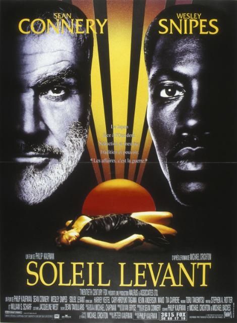 Soleil Levant est un peu le Black Rain en plus sérieux. A travers une ambiance très sombre et extrêmement sérieuse, preuve en est avec sa musique pleine de tension et ses décors très noirs, le film avec Sean Connery et Wesley Snipes se révèle au final très complexe. Adapté d'après le roman du même nom, celui-ci parvient assez bien à retranscrire les différences entre la société occidentale et l'empire nippon. Le film aurait toutefois gagné en intérêt s'il se serait avéré moins compliqué et plus généreux sur les explications. A noter que le personnage principal porte le nom de John Connor ! Le film est construit sur deux bases, la première étant la culture japonaise et son exportation aux États-Unis tout fonctionne encore très bien. La seconde repose par contre sur la "haute"-technologie de l’époque, et sur ce second point, le film a vieillit et offre quelques longueurs. Mais l'intrigue, mêlant corruption politique, sexe et choc des cultures garde toute son intensité et les acteurs, Connery principalement, tire leur épingle du jeu. Le cadre du milieu des affaires et de la culture nippone pouvait donner un cadre intéressant pour ce genre de polar ( à condition bien sur de ne pas tomber dans la caricature sur cette culture). L'exécution est plutôt réussi puisqu'il s'agit d'un film policier plutôt prenant. Malgré quelques longueurs, on est de plus en plus pris par le film à mesure que l'intrigue se complexifie, notamment après le rebondissement qui vient clore le premier acte et relancer l'histoire. Sans atteindre les sommets du genre et le savoir-faire des maîtres du polar, le film n'est pas dénuée d'atmosphère et s'il est difficile de relever un style proprement identifiable et personnel dans la réalisation, Kaufman compose une mise en scène tout à fait honorable. Un thriller réussi mais qui malgré son casting et ses qualités a l'audace de se faire oublier et de rester méconnaissable aux yeux des spectateurs. Un peu dommage, car c'est un thriller très intéressant, dont l'enquête accompagnant tout le film a su me captiver, et puis une enquête avec le fond d'une culture japonaise, on en voit pas toujours. Dès les dix premières minutes du film, notre enquête commence et reste prenante du début jusqu'à la fin du film. Par contre, il faut quand même avouer que le film est loin d'être parfait, bien qu'il ait des qualités, il souffre aussi de défauts. A mon goût, le film manque d'originalité, nous avons donc droit à un scénario sans surprises, dommage, car cela aurait pu rendre le film génial. Pourtant le rythme est au rendez-vous, on a droit à du suspense, à de l'action, malgré que certaines scènes peuvent parfois tourner en longueur, et auraient pu être raccourcies. Un film qui montre bien ce qui se passe quand une culture (Japonais) fait du malheur dans un autre pays (États-Unis) avec un problème politique. N'ayant pas lu le roman inspiré de ce film, l'histoire me paraît bien un peu simple mais très culturel sur les manières Japonais. Wesley Snipes et Sean Connery forment un drôle tandem mais on peut percevoir une bonne entende entre ces deux acteurs. Le film se montre un peu banal dans la plupart des scènes mais on peut toujours écouter les expressions bien choisis de Sean Connery,. Les décors sont pas mal. Des costumes bien manque quelque chose pour que film soit vraiment bien. Peu d'actions, ce qui amène que le film nous ennuie un peu. Un film assez moyen dans l'ensemble.