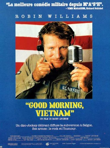 Un film divertissant mais reposant uniquement sur les épaules de Robin Williams débordant d’énergie mais qui fatigue et lasse un peu sur la fin. L’humour est particulier mais le film se laisse regarder. On reprochera néanmoins une certaine simplicité sur un conflit historique de l'histoire. Barry Levinson m'avait enthousiasmé aver Rain man, qui est resté un de mes films préférés. Je me suis donc attaqué à son autre film culte : Good morning Vietnam. La première chose à dire sur ce film, c'est qu'il m'a déçu. Il a des points forts : l'excellente prestation de Robin Williams, le fait que pour une fois un film sur la guerre du Vietnam nous montre cette guerre du côté vietnamien et la critique de cette guerre ( enfin rares sont les films sur la guerre du Vietnam à être pour cette guerre, ce qui est logique ). Par contre les séquences de radio de Robin Williams ne m'ont pas plu du tout. L'humour est particulier ( faut aimer ) ; des vannes balancées avec des imitations qui en deviennent lourdes. Le scénario est également assez faible. Good morning Vietnam est un bon film, sans plus. Barry Levinson offre à Robin Williams l’un de ses rôles les plus marquants, en DJ roublard et excessif, bravant seul contre tous la loi, dans le seul but de redonner le sourire aux troupes américaines embourbées dans l’enfer du Vietnam. Une comédie dramatique certes un peu pataude mais qui a marqué le public en son temps avec, là aussi, une bande son d’anthologie... Cette comédie grinçante vaut plus pour les relations conflictuelles qu'entretient le personnage interprété par Robin Williams (en grande forme) avec sa hiérarchie que pour les gags radiophoniques souvent difficiles à comprendre pour le spectateur français. Le lieutenant qui croit posséder des talents de comique m'a bien fait rire. Le film aborde indirectement des questions plus sérieuses comme la censure et l'engagement américain vu par la population locale (aide ou invasion ?). Good Morning, Vietnam est un très bon film. Ma deuxième découverte du très bon réalisateur Barry Levinson qui nous sert un beau film avec une belle histoire. Il traite de la guerre du Vietnam de façon légère et souvent drôle. Même si le comique incarné de l’animateur de radio joué par l’excellent Robin Williams ne nous emporte pas toujours, l’on passe tout de même relativement un très bon moment et les répliques m’ont souvent emporté au rire. Un film intéressant, original, bien fichu doté d’une belle réalisation, d’une superbe bande son et d’un très bon casting. Un carton au box-office américain et même classé 363ème dans le top 500 des plus grands films de tous les temps selon le classement du magazine Empire publié en 2008 ! Faut pas pousser !... Sur le fond tout repose sur les pitreries de Robin Williams mais les dialogues des gags restent tout de même très moyens. Niveau radio reste alors l'excellente BO ! Un film surestimé assurément mais un vrai bon film tout de même, à la fois inoffensif et efficace. Ce film voudrait être un documentaire, proposant une nouvelle vision de la guerre du Viet-Nam. Bien évidemment, on en est très loin car pas grand chose ne sonne juste. Néanmoins, il faut souligner l'excellente prestation de Robin Williams, sans qui le film ne serait pas grand chose.