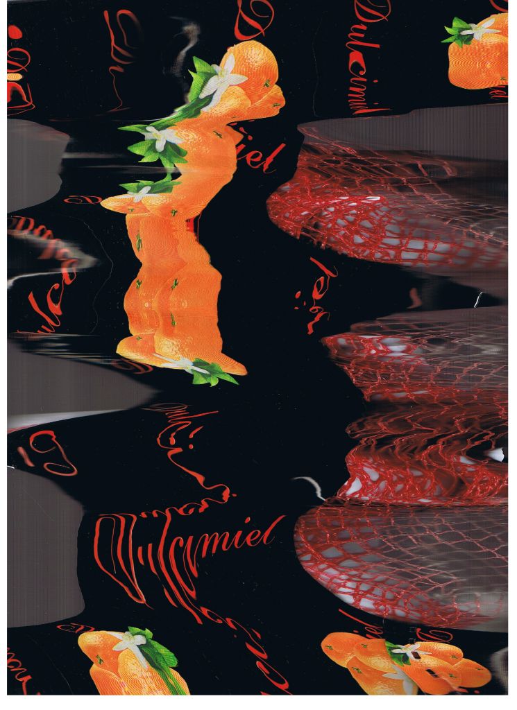 | ...ici , le processus anamorphique s'est porté sur une simple étiquette de filet de clémentines,...c'est donc bien ce fruit qui apparaît ici, ne conservant en somme que sa couleur tandis que ses nouveaux contours se prêtent à tous les fantasmes de formes, sortes de personnages, ou d'éléments d'anatomie...(c'est le côté "Arcimboldo" de Maldor...) |