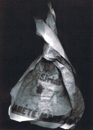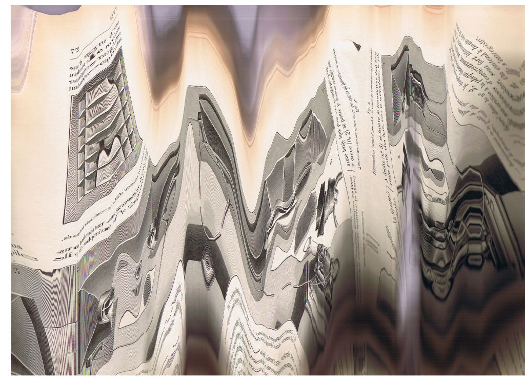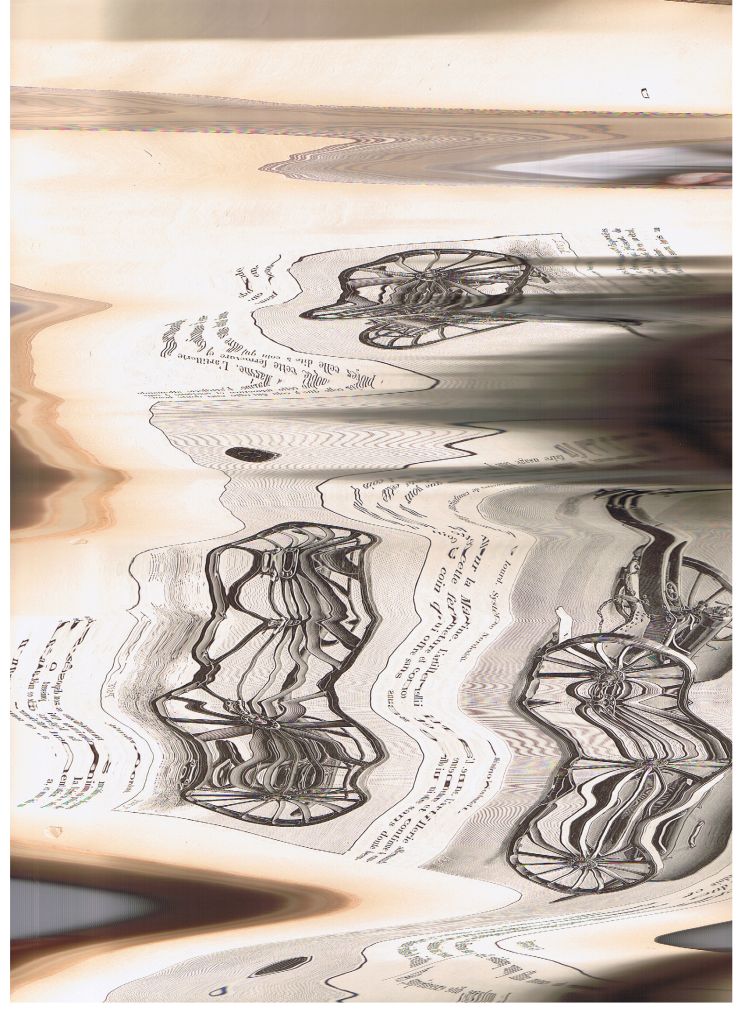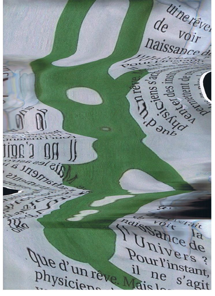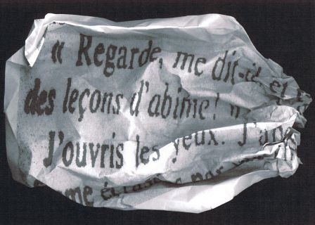 | ...Ici, tiré de la série des papiers froissés littéraires ou classiques, choisi parmi de nombreuses "papillotes" faites au hasard, un déplié du "Voyage au centre de la Terre" de Jules Verne... |