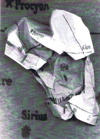 | ...même recherche pseudo-hasardeuse, ici avec une carte du ciel...Maldor prend ce procédé de chiffonnage assez au sérieux puisqu'il n'y voit ni plus ni moins que le dernier avatar de la pierre philosophale, espérant peut-être trouver dans ce qu' il appelle les "minimalistes" ainsi obtenus, donc principalement par l'effet du hasard, d'une part l'essentiel de l'oeuvre ou du domaine envisagés, d'autre part, qui sait, la science infuse... |