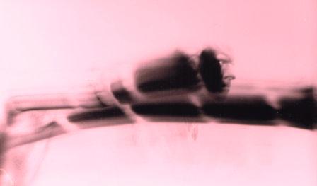 | ...Ici, il s'agit donc toujours de la série des autoportraits au sténopé (curieusement initiée au Louvre-cf. maldorscopie-p6) dit aussi à la "boîte à chaussures" . En réalité, Maldor n'utilise pas à proprement parler une telle boîte car il a trouvé un support moins encombrant, n'ayant gardé en quelque sorte que le "trou d'aiguille" puisque c'est l'essence de ce procédé (très ancien) à la fois minimaliste et maximaliste, car pouvant plus ou moins tout enregistrer, associant un peu si on veut photo et cinématographie puis qu'il peut garder en mémoire le mouvement. En effet, l'image ci-dessus, par exemple, a été obtenue en une seule fois (il n'y pas de surimpression ou autre...) par l'effet de la "pose dynamique" (ou dynamisée) qui consiste pour Maldor à évoluer devant l'appareil en pensant à la trace que son seul visage éclairé dans le noir pourra laisser sur l'émulsion...(Ou la façon inimitable qu'il a de faire de sa propre tête une sorte de pinceau virtuel dont il maîtrise alors d'une façon étonnante les effets picturants et dessinants qui ne seront révélés qu'après coup par le développement...) |
