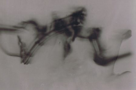 | ... Bien qu'il chérisse ce procédé essentiellement pour la difficulté avec laquelle il rend compte de la réalité des choses et donc le peu de chance qu'il puisse jamais, de la sorte, se voir vraiment tel qu'il est, on trouve certains clichés où le stratagème est moins radical et laisse voir sinon une authentique ressemblance, du moins une vague analogie avec ce curieux artiste qui prétend se photographier lui-même en se montrant le moins possible (et à la limite pas du tout comme on le verra ci-dessous)... " Mes amis, avec cette boîte finement trouée (le fameux trou d'aiguille qui remplace l'objectif!), comme il faut s'agiter hardiment pour laisser une trace !" (Il veut dire pour ne laisser qu'une trace , se montrer le moins possible donc, mais une trace suffisante tout de même pour être significative et susciter sinon un vrai questionnement du moins un étonnement très dubitatif, une certaine perplexité...) "Pour se louper tout à fait, cela demande grande expérience et persévérance, j'y arriverai ! " déclarait-il en conclusion à sa brève et bien timide allocution lors d' une sorte d'exposition à laquelle il avait participé à Turin il y a des années (il y avait d'ailleurs eu ce jour-là un tremblement de terre!), quelques critiques italiens ayant curieusement trouvé en lui une manière d'héritier ou de continuateur de la grande époque des futuristes ( qui eux aussi dans leurs toiles avaient essayé de représenter le mouvement des corps ou des objets) ... |
