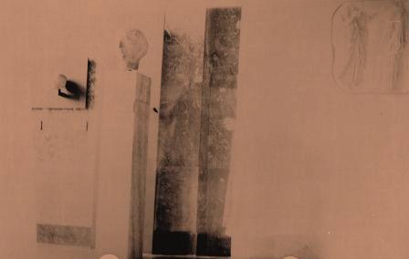 | ... Ici, il a quasiment disparu, s'étant comme brumisé ou transformé en colonne. "Mon meilleur portrait !" aurait-il dit. Peut-être se voit-il (ou se verrait-il bien) comme cette tête posée sur un tronc, passant ses jours à souffler sur la poussière brun-rouge si catactéristique de l'endroit...un long ruban flottant, porteur d'un message, sortant de sa bouche chaque fois que la salle se serait vidée de tout visiteur , aussitôt ravalé à l'approche de nouveaux venus... |