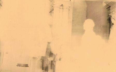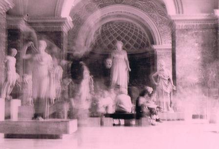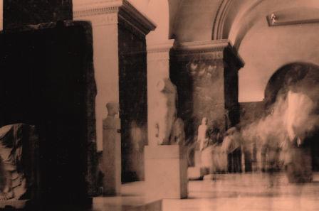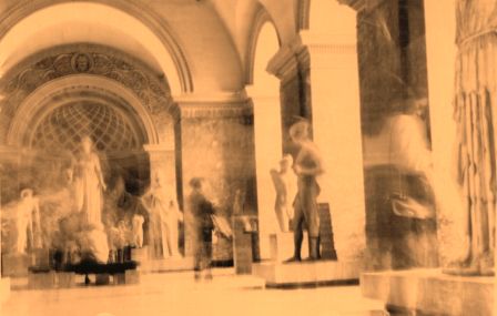 | ... Ce procédé assez incertain lui a été l'occasion d'aborder l'autoportrait, comme ici dans une salle du Louvre... Et avouons qu'il est difficile de le taxer de narcissisme, d'autant qu'il est non dans la silhouette blanchâtre qui se découpe à droite (c'est un marbre antique) mais plus ou moins vers le milieu du cliché où il a eu bien du mal à laisser un semblant de trace un peu à gauche des deux colonnes ! |