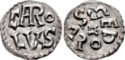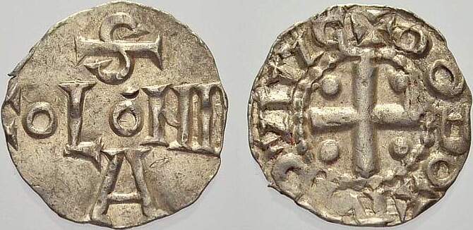 c.935 GERMANIE Cologne Denier (ar) (18 mm - 2.2g) S COLONI A (monogramme) / Croix cantonnée de points (n°29) Contrairement aux autres ateliers, celui de Cologne (Köln) continua le type carolingien du nom de la cité dans le champ pour une des pièces les plus connues de l'époque.