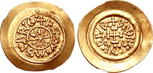 Trémisse (or pâle) (19mm - 1.5g) Motif en étoile au centre d'un cercle. / Croix potencée (n°15) Unification du monnayage au même type. (Etoile / Croix). A noter l'apparition de la légende entre deux cercles (reprise par Charlemagne qui mettra fin en 781 au monnayage d'or lombard après sa conquête du royaume dont il conservera les ateliers pour y produire des deniers carolingiens ).