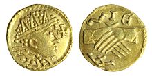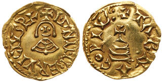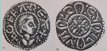 ANGLO-SAXONS (Angleterre) Thrymsa (or) (13mm - 1.3g) Buste radié à d. / Mains jointes. (n°9) Après des trémisses continentaux d'importation, des pièces d'or de même espèce, du nom de "thrymsa", furent frappées à Londres et dans le Kent. Le taux de 70% de fin du début baissa graduellement jusqu'à <35% (électrum ou "or pâle") en 655. Pour finir, c.675, l'argent fut seul frappé (denier-sceat)