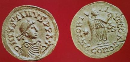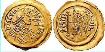 6ème s. BURGONDES Trémisse pseudo-impérial (or) ( 17mm - 1.4g) Buste diad. à d. / La Victoire à d. Les Burgondes s'installent dans le Centre-Est de la Gaule dans des régions qui deviendront la Bourgogne et la Suisse romande (leur capitale est à Genève). Leur monnayage est également d'imitation (ici au nom de l'emper.byz. Justin II avec le monogramme du roi burgonde) (n°5).
