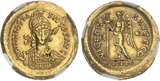 ITALIE - OSTROGOTHS -Théodoric (493-526) Solidus pseudo-impérial (au nom de l'empereur d'Orient Anastase) (or) (20mm - 4.4g) (Rome) (n°3) Buste casqué et cuir. de f. (l'emper.) / La Victoire à g. tenant une longue croix. Les Ostrogoths de Théodoric envahissent l'Italie du Nord et chassent Odoacre de Ravenne d'où ils dirigeront aussi leur royaume (toute l'Italie et la Sicile) jusqu'en 553 (conquête byzantine).