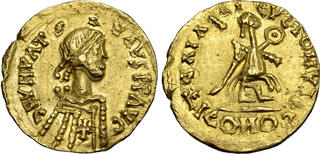 Trémisse pseudo-impérial (or) ( 18mm - 1.5g) Buste diad. à d. / La Victoire à d. Les peuples migrants (dits "barbares") venant de l'Est ont commencé par imiter les monnaies romaines dans un style souvent reconnaissable, plus fruste (avec légendes fautives et au nom d'anciens empereurs), monnayage désigné comme "pseudo-impérial" (ou d'imitation). Ici un trémisse des Wisigoths (sud-ouest de la Gaule et Espagne) avec au revers la Victoire à la déformation caractéristique (n°4).