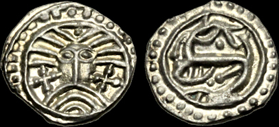 ROY. de NORTHUMBRIE - Eadberht (737-758) Sceat (ar) (12mm - 1.0g) Tête du dieu Wodan de face. / Animal fantastique. (n°13) Les archevêques de York (734-900), autre autorité monétaire de la période anglo-saxonne, émettaient aussi des sceats (en association avec les rois de Northumbrie).