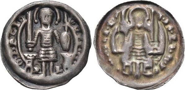 1162 HONGRIE Petits deniers (11mm-0.4g)et oboles bifaces(dessins géom. ou tête de f.)+follari de cuivre. type byzantin. 1166 SICILE NOR,MANDS -Follaro bilingue (latin/arabe) et trifollaro au masque de lion / palmier (n°49) 1167 SUEDE Petites bractéates (17 à 10mm-0.3 à 0.1g) (tête,buste) et demi-bractéates très minces (0.15g). 1172 VENISE Petites monnaies d'argent (billon) "à la croix de chaque côté" concaves (0.35g à 250/1000).