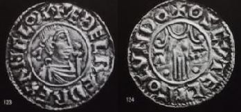 Penny (Denier) (ar) (20mm - 1.4g) Buste diadémé ("romain") sceptre / Main descendant du ciel. (n°33) 975 la réforme d'Edgar rend le penny mieux frappé, de poids régulier et de type unique (Buste / Main). 987 Type "à la 2ème main" ne différant du premier que par un sceptre devant le buste(n°33) et par une légère modification du nuage d'où descend la main de Dieu.
