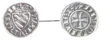 Maille (ou petit denier) (ar) (10mm - 0.4g) (n°46) Le monnayage commence à se distinguer de celui des voisins germaniques. Le denier est réduit à 10mm et 0.4g mais à 900/1000 d'argent. Essentiellement ducal ou comtal, il devint principalement municipal vers la fin du siècle.
