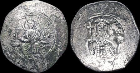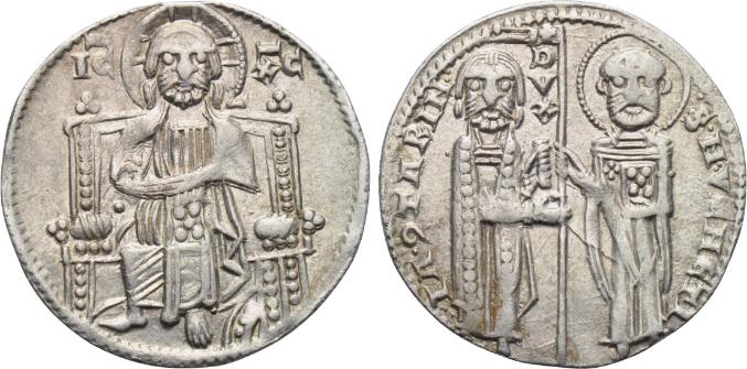 VENISE Matapan (Grosso) (ar) (20 mm - 2.2g) Christ trônant / Saint-Marc tendant la bannière au Doge. (n°54) Alors que les monnaies d'Italie du Nord n'étaient plus que de très bas billon, afin de financer la construction de navires pour les Croisés, Venise frappa un multiple du denier d'un poids de 2.2g à 965/1000 d'argent fin et d'une valeur de 24 deniers. Ce gros restera longtemps connu sous le nom de "matapan" à la réputation internationale.(n°54)