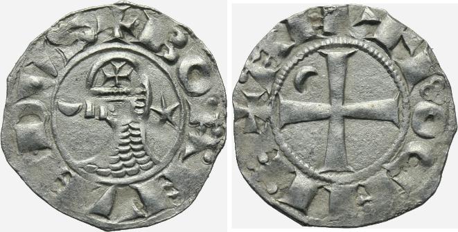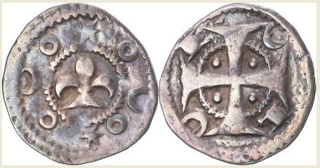 (les Croisés au Proche Orient) Denier (ar) (18mm - 1.0g) (Principauté d'Antioche) Tête casquée à g. entre un croissant et une étoile / Croix cantonnée d'un croissant (n°43). Les Croisés fondent un royaume et des principautés où ils frappent monnaie : besants d'or (imitation du dinar fatimide), deniers d'argent (n°43) et des bronzes (inspirés des ateliers normands d'Italie du Sud (n°39)