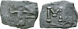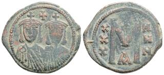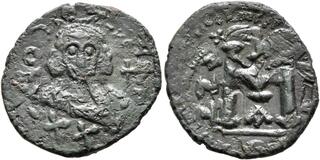 III717-741 Leo III l'Isaurien Follis (cu) (21mm- 5g) Bustes de Leo et de son fils ConstantinV de f. / M (n°68) Le follis comportait une série lourde (10g) et une légère (5g). Au revers les lettres XXX et ANN de chaque côté sont désormais factices, sans rapports avec la valeur ou la date. |