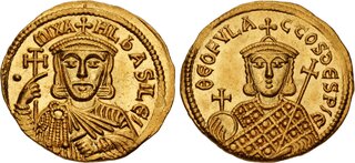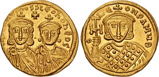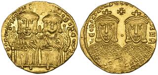 Solidus (or) (21mm - 4.4g) Buste de l'empereur de f. vêtu de la chlamyde et tenant une croix potencée / Buste de Theophylacte (fils) de f. vêtu du loros, tenant le globe crucifère et un sceptre cruciforme (n°84)