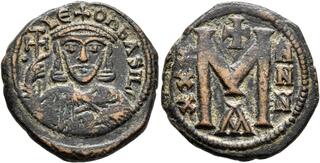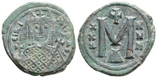 711-713 Philippicus Follis (cu) (23mm - 4g) Buste de l'emper. couronné de face, tenant le globe et le sceptre surmonté d'un aigle / M (n°61)