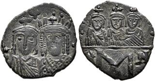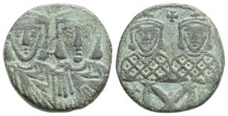 Leo IV Follis (cu) (18mm- 4g) Bustes de Leo IV et de son fils (vêtus de la chlamyde/ Bistes de f. de Leo III et Constantin V vêtus du loros. . (n°74)