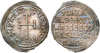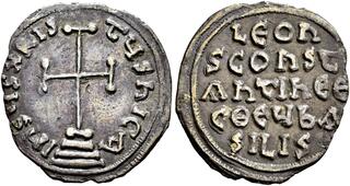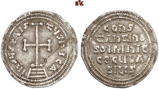 Constantin VI Miliaresion (ar) (19mm-1.5g) Croix potencée sur trois degrés / Inscription sur cinq lignes (n°76) Pour ce règne la croix est moins haute, la barre transversale plus large coupant au milieu.
