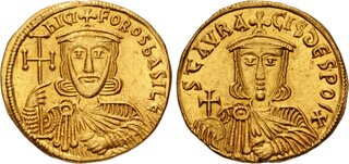 Solidus (or) (21mm - 4.4g) Buste de l'emper. de face tenant une croix potencée / Buste couronné de de Stauracius (auguste) tenant le globe crucifère (n°81)