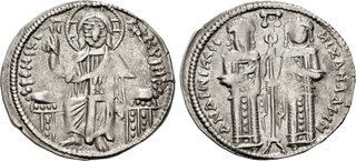 Andronicus II Basilikon (ar) (21mm-2.2g) Le Christ pantokrator trônant et bénissant / L'emper. et Michel IX (n°210) Nouvelle monnaie d'argent le basilikon se rapprochant (type, diam., poids) du matapan de Venise.