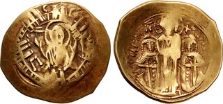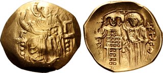 Hyperpéron (or) (24mm-4.1g) (scyphate) La Vierge orans entourée des murs de la ville / Le Christ couronnant l'emper. et Michel IX. (n°209) L'hyperpéron diminue de 15 à 14 carats, tombant par la suite à 12 soit 50% d'or fin. |