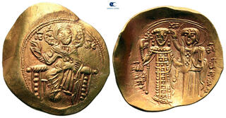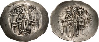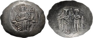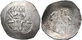 Trachy d'argent (ar) (32mm-3.5g) Christ trônant / L'emp. et St Theodore (n°190) A Magnésie le trachy d'électrum fut abandonne (pénurie d'or probable) au profit d'un trachy d'argent premier du genre.