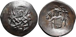 Trachy de billon (ar+cu) (33mm-4.6g) (scyphate) Christ tronant / L'emp. et l'archange Michel tenant entre eux un petit château de la ville (n°198)