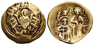 III (1222-1254) Hyperpéron (or) (28mm-4.5g) (scyphate) Le Christ trônant de f. bénissant et tenant les Evangiles / L'emper. en loros couronné par la Vierge debout à sa g. (n°192) Réintroduit la monnaie d'or. |