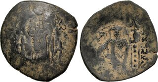 Les Latins à Constantinople Trachy de cuivre (cu) (27mm-3.4g) (scyphate) Buste du Christ de f. / L'emper. de f. vêtu du loros tenant une longue croix et un sceptre fourchu. (n°184)