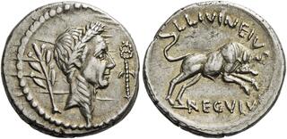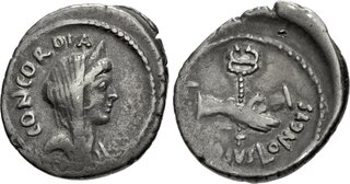44-28 av Tête de Sol, au revers 2 statues de Vénus Cloacina ("des égouts") dont le sanctuaire sur le forum se situait à l'entrée de la "Cloaca Maxima" (le grand égout de Rome) (42av) (n°128)