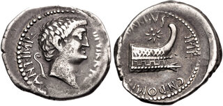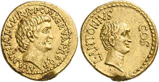 44-28av Auréus (or) (20mm - 8.2g) Marc Antoine / Octavien (futur Auguste) consul. (41av) (n°141)