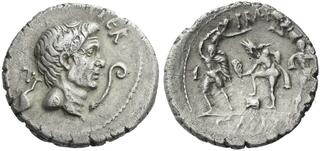 44-28av Tête de Pompée le Grand / Neptune entouré d'Anapias et d'Amphinomus portant leurs parents sur leurs épaules. (42av) (n°131) (Denier de Sextus Pompée, général romain et plus jeune fils de Pompée le Grand).