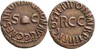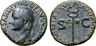 14-37 Tibère As (br) (30mm - c.11g) (Rome) Buste lauré Sà g. / Caducée L'espèce de bronze la plus courante était l'as produite (avec ses multiples) en majorité par les ateliers impériaux de Rome et de Lyon, secondés par les émissions locales ou régionales d'Espagne ou d'Asie. (n°197)