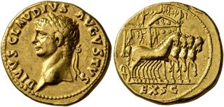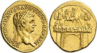 41-54 Claude Auréus (or) (22mm - 7.8g) Buste lauré / Claude à cheval entre 2 trophées sur un arc de triomphe inscrit "DEBRITANNIA" après sa conquête de la Bretagne (=Angleterre) en 47. (n°202)