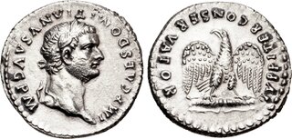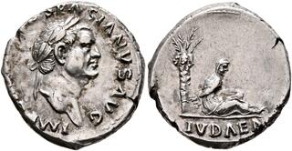 Denier (ar) (19mm-3.4g) Buste lauré / La Judée captive au pied d'un palmier (n°220) Avec l'aide de son fils Titus, il met fin à la révolte en Judée et impose un impôt spécifique à ses habitants.