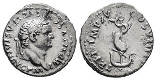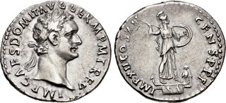 Domitien Denier (ar) (19mm-3.2g) Au revers, Minerve en position de combat. (n°225) Il distribue 135 millions de sesterces sous forme de dons (donativa) au peuple. |