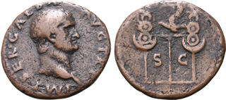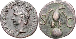 Dupondius (br)(orich.) (28mm - c.14g) (Rome) Tête radiée* de l'empereur et aigle sur un globe. (n°196) *(les têtes étaient radiées sur les dupondius et laurées sur les sesterces et les asses.)