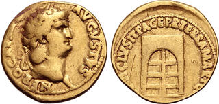 Auréus (or) (20mm - 7.3g) Au revers, temple de Janus portes fermées (signe de paix dans tout l'Empire). (n°207) Allègement de l'auréus (de 7.8g à 7.3g) et du denier (de 3.7g à 3.2g) mais toujours de métal fin. (Probablement pour tenir compte de la hausse du prix des métaux et/ou des dépenses de reconstruction suite au récent grand incendie de Rome en 64)