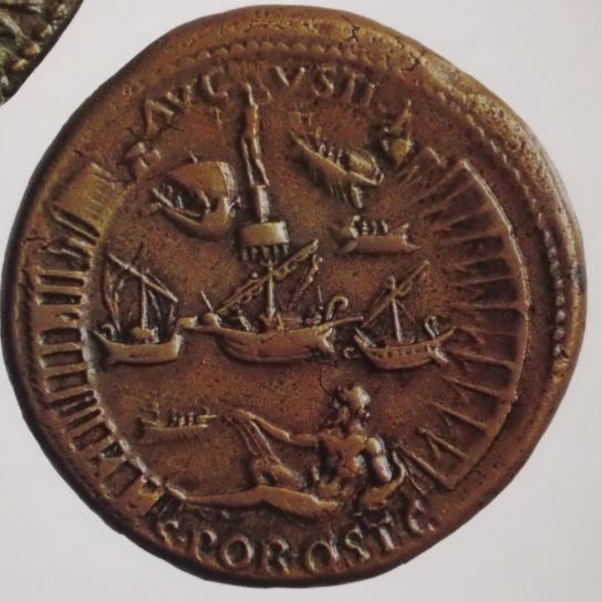 Sesterce (br)(orich.) (34mm - 29g) Buste lauré (n°209) / Port d'Ostie (n°210) Style et niveau artistique à leur apogée principalement sur les sesterces : vue "aérienne" du port d'Ostie. (n°210-agrandissement ci-dessous) (L'alliage "orichalque" est étendu sous ce règne à l'ensemble des pièces de bronze).(voir G-4)