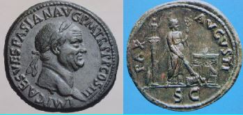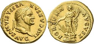 Vespasien Auréus (or) (22mm - 7.4g) Buste lauré / Fortuna tenant une corne d'abondance et un gouvernail. (n°219) Pour renflouer le Trésor vidé par les désordres de "l'année des 4 empereurs" (69), il augmente lourdement les impôts allant jusqu'à créer une taxe sur l'urine (utilisée en teinture) en arguant que l'argent même ainsi prélevé n'a pas d'odeur.