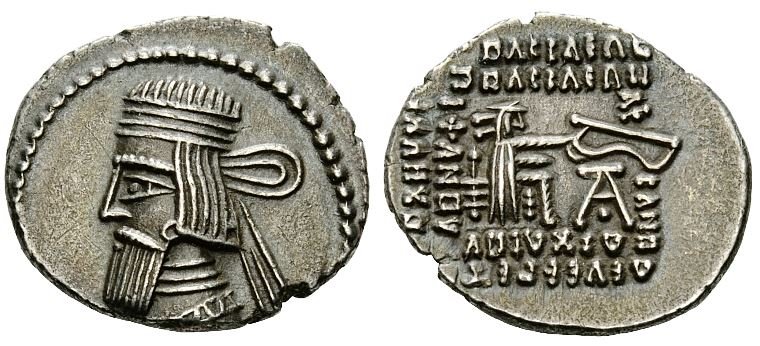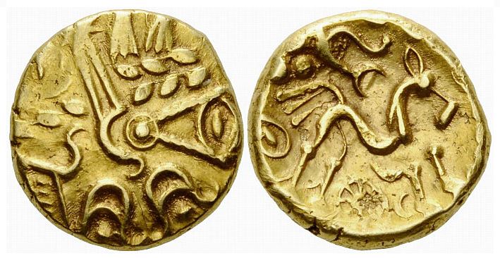 | GAULE(Celtique)-Suessiones(c.80av)- Statère(or)(17mm-6g) | PARTHES(Roy.)-ArtabanII(75-62av)- Drachme(ar)(c.70av)(19mm-3.6g) |
