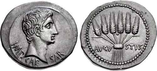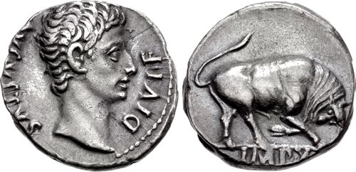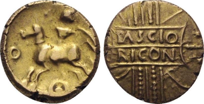 | ROME-EMP-Auguste- Denier(ar)(15-13av)(17mm-3.7g) | CELTES -(England)(Tasciovanus)- Statére(br)(c.15av)(21mm-3.5g) |
